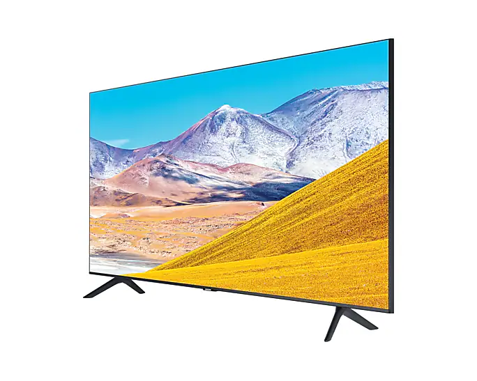 Awarded to 43″ and 55″ Samsung TU8000 Crystal UHD 4K Smart TV in 2020 based on customer reviews. Screen image simulated. Cable not shown.